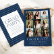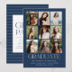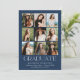 Convite de festa de formatura minimalista com nove de suas fotos em um layout de grade. O "Formando" é apresentado em caracteres brancos modernos, com o nome do formando, o nome da escola, o ano de graduação e os planos futuros apresentados abaixo, em contexto de marinho. A parte traseira do convite para festa de formatura com várias fotos apresenta os detalhes de sua festa de formatura com um marinho simples e um fundo listrado branco. Este convite para festa de formatura fotográfica é perfeito para formandos segundos graus e universitários.