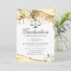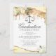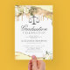 Convites elegantes de festa de formatura de direito com bordas de cristal de ágata brilhante amarelo e dourado, flores de aquarela branca, balança da justiça e um modelo de celebração formal fácil de personalizar.
