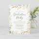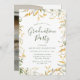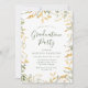 Elegantes convites para festas de formatura florais com detalhes de sua festa de formatura em letras verdes escuras, emoldurados por flores aquáticas em tons de amarelo vibrante e dourado com folhagem verde-escura. O convite reverte para exibir sua foto vertical de sangramento de cheio. Os convites para a graduação floral amarela são perfeitos para formandos segundos graus e universitários.
