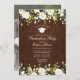 Um elegante convite à festa de formatura rústica, com elementos de aquarela florais brancos num fundo de madeira falsa, com fotografia invertida. Copyright Elegant Invites, todos os direitos reservados.