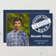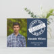 Este moderno e simples convite de festa de formatura com tipografia branca dentro como um círculo como um selo, que lê "classe de" e o ano de graduação, num fundo azul marinho é perfeito para um segundo grau ou formandos. Basta incluir a foto do formando, o nome e o ano de graduação. Preencha todas as informações da parte traseira do cartão. Outras cores de fundo também estão disponíveis em nossa loja.