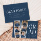 A festa de formatura Trendy convida com uma fita de vídeo com 6 fotos quadradas do formando. O "Formando" é apresentado em caracteres brancos modernos, com um fundo azul escuro (a cor de fundo pode ser alterada). Personalize a frente do convite para festas de formatura multifotos adicionando o nome do formando, o nome da escola e o ano de graduação. O convite reverte para exibir seus detalhes de festa de formatura em letras brancas com um fundo azul escuro. O convite à festa de formatura moderna é perfeito para formandos segundos graus e universitários.