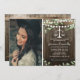 Convites de festa de formatura da lei russa, com fundo de madeira, uma foto do formando, elegante verde-aquarela, lanternas, escalas de justiça e um modelo de texto moderno que é fácil de personalizar.