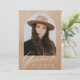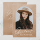 Convites de festa de formatura elegantes com dentro de fotografia de formando de um quadro de arco com fundo de aquarela de areia. "Formando" é exibido em um roteiro branco moderno de caligrafia com o nome do formando, a escola e o ano de formando mostrado abaixo. A parte de trás do convite para festa de formatura de fotos apresenta os detalhes da sua festa de formatura com um fundo de cor d'água bege arenoso.