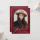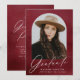 Convites de festa de formatura elegantes que incluem o dentro de foto do formando de um quadro de arco com fundo de cor d'água entrelaçado. "Formando" é exibido em um roteiro branco moderno de caligrafia com o nome do formando, a escola e o ano de formando mostrado abaixo. A parte de trás do convite para a festa de formatura de fotos apresenta os detalhes da sua festa de formatura com um fundo de cor d'água burgundy.