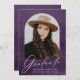 Convites de festa de formatura elegantes que incluem o dentro de fotos do formando de um quadro de arco com um fundo de aquarela roxa. "Formando" é exibido em um roteiro branco moderno de caligrafia com o nome do formando, a escola e o ano de formando mostrado abaixo. A parte de trás do convite para festa de formatura de fotos apresenta os detalhes da sua festa de formatura com um fundo de cor d'água roxa.