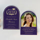 Convite de festas roxo, em forma de arco, com "Classe de", dentro de uma ilustração dourada de uma coroa, um boné e diploma de formando dourado, e o nome do formando em uma elegante escrita dourada. Adicione sua escola, major, honras ou planos futuros na tipografia clássica da serifpografia de ouro. No verso, adicione a foto e os detalhes da festa.