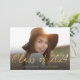 Este é um convite elegante para festas de formatura de segundo grau usando uma sobreposição de fontes de script dourado junto com uma foto minimalista do solteiro na frente. O lado inverso inclui uma mensagem que você pode personalizar. Entre em contato com o designer para obter informações relacionadas a este design.
