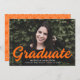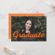 Convite simples e na moda com festa de formatura apresentando a foto horizontal do formando com "Formando" em um script em cor de laranja em negrito. Personalize o convite para festa de formatura de fotos adicionando o nome do formando, o nome da escola e o ano de graduação. O convite reverte para exibir seus detalhes de festa de formatura com um plano de fundo geométrico em laranja e branco.