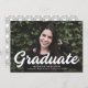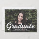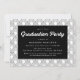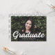 Convite de festa de formatura simples e na moda com a foto horizontal do formando com "Formando" em um script branco em negrito. Personalize o convite para festa de formatura de fotos adicionando o nome do formando, o nome da escola e o ano de graduação. O convite reverte para exibir seus detalhes de festa de formatura com um plano de fundo de arco geométrico preto e branco.