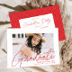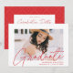 Convide convidados para comemorar a formatura com nossos convites para festa de formatura de fotos modernos. Os convites da festa de formatura de tendências apresentam a foto do formando com "Formando" em uma cobertura vermelha de script de caligrafia moderna. Personalize a frente dos convites adicionando o nome do formando, o nome da escola e o ano de graduação. O convite reverte para exibir seus detalhes de festa de formatura e um padrão geométrico pontilhado vermelho e branco.