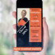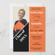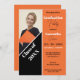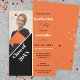 Este é um convite personalizável para fotos de festa de formatura que exalta uma vibração moderna e elegante. O design é dividido em duas seções distintas, cada uma contribuindo para a estética contemporânea geral. À esquerda, há uma foto do formando e uma grande faixa diagonal corta sobre um fundo laranja sólido, contendo o texto personalizável "Classe de 20XX". Isso lhe permite personalizar o convite com o ano de graduação específico, fazer-o como uma perfeita manutenção para o formando. O lado direito do convite é dedicado aos detalhes do evento, colocados contra um fundo laranja limpo. O estilo gráfico é elegante e moderno, caracterizado por linhas limpas e cores contrastantes. O uso de diferentes tamanhos de fonte e pesos cria uma hierarquia visual, fazer o convite fácil de ler enquanto chama a atenção para detalhes importantes.
