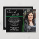 Um anúncio de festa de formatura verde e preto com um modelo de foto na frente e bastante espaço no verso para mais informações. Arte vetorial original pela Menagerie da Night Owl, 2015.