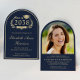 Convite de festas azul-escuro em forma de arco elegante com "Classe de" numa coroa de ouro, boné e diploma de formando de ouro, nome do formando numa escrita de caligrafia de ouro, e a sua escola, major, honraria ou planos futuros na tipografia clássica da serifa de ouro. No verso, adicione uma foto e personalize seus detalhes do partido.