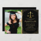 Celebre seu marco em estilo com nossos convites elegantes de festa de formatura de advogado. Com seu fundo na moda preto e sotaque dourado, esses convites dão um tom brilhante para seu evento especial. Personalize-o ainda mais com uma fotografia do orgulhoso formando, as escalas simbólicas de justiça e uma modelo de texto personalizada. Mude a cor de fundo para o seu gosto e faça da sua festa de formatura um evento para se lembrar!