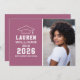 Anuncie seu segundo grau ou formando universitário em estilo com este anúncio de graduação e convite de festas. A placa de dois lados apresenta um retrato mais velho do formando com boné formando e design de tipografia branca simples e moderna. O fundo cor-de-rosa/vermelho-berço pode ser alterado para uma cor diferente com o recurso "Personalizar" e, em seguida, Editar/Fundo para selecionar outra cor.