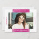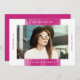 Convide convidados para sua festa de formatura em estilo com nosso convite para festa de formatura de fotos pintadas. Os convites à festa de formatura moderna apresentam um traço ousado e magenta no meio. Personalize a frente adicionando sua foto favorita de mais velho, o nome do formando, a escola e o ano de graduação. A parte traseira apresenta espaço para uma segunda foto com os detalhes da sua festa em branco contra um fundo magenta.