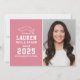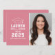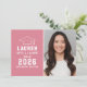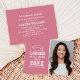 Anuncie seu segundo grau ou formando universitário em estilo com este anúncio de graduação e convite de festas. A placa de dois lados apresenta um retrato mais velho do formando com boné formando e design de tipografia branca simples e moderna. O fundo cor-de-rosa pode ser alterado para uma cor diferente com o recurso "Personalizar" e, em seguida, Editar/Fundo para selecionar outra cor.