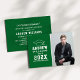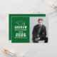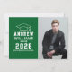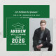 Anuncie seu segundo grau ou formando universitário em estilo com este anúncio de graduação e convite de festas. A placa de dois lados apresenta um retrato mais velho do formando com boné formando e design de tipografia branca simples e moderna. O plano de fundo verde pode ser alterado para uma cor diferente com o recurso "Personalizar" e, em seguida, Editar/Fundo para selecionar outra cor.