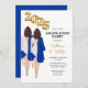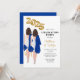 Convite de Festa de Formatura de Gêmeas para celebração conjunta de formatura das irmãs gêmeas. Retrato de mulheres gêmeas em vestido branco com batas de formatura azul-marinho e boinas de graduação com balões dourados para a turma de 2025.