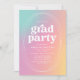 A festa de formatura moderna convida com um quadro geométrico único, com um fundo de gradiente arco-íris multicolor. A "Parte Formando" é apresentada em caracteres brancos a negrito com o nome do formando e os detalhes da parte mostrados abaixo. Os convites para a festa de formatura de tendências são perfeitos para formandos segundos graus e universitários.