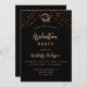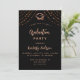Um fundo preto decorado com estrelas douradas rosa e um boné. Personalize e adicione um nome e detalhes da parte. O texto Graduação e o nome são escritos com um script de estilo moderno, escrito à mão.