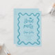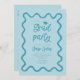 Cartão de convite de festa de formatura engraçado, com desenho à mão e quadro ondulado. Fundo azul.