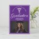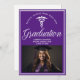 Este convite personalizado de festa de formatura de medicina roxo para enfermeira ou médico apresenta tipografia branca clássica sob um caduceu médico e o nome da sua faculdade para a turma de 2025. Personalize com o ano de sua formatura sob a caligrafia elegante para um cartão de graduado universitário personalizado.