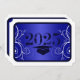 Um cartão de festa de formatura azul e branco convidando os apaixonados a honrar um formando maravilhoso em seu dia especial de celebração. As informações relativas ao convite à festa de formatura são escritas no verso com letras brancas.