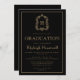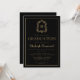 Este design de convite clássico, elegante, para festa de formatura de apresenta um monograma de cor dourada em letra serif aberta rodeada por uma crista de acanthus de linha num fundo preto. Personalize o texto com o nome do formando e os detalhes da parte. Uma borda retangular de cor dourada enquadra o design. A parte traseira da placa é preta e sólida. Ideal para segundo grau, faculdade ou formando universitário.