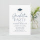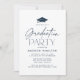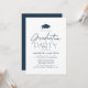 Convites de festa de formatura moderna com um boné de formatura preto no topo do design com "Festa de formatura" mostrada na tipografia do marinho em um fundo branco. Personalize o convite de festa de formatura minimalista com o nome do formando e os detalhes do partido. O convite para festas de formatura marinhos é perfeito para celebrar formandos de segundo grau e de faculdade.