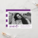 Convide convidados para a sua festa de formatura com nossos convites para festas de formatura de Script de Pincel de Cor de Água Moderna! Os convites de festa de formatura modernos exibem a foto do formando moldada em branco com "formando" em um script de escova de cor da água roxa da tendência. Adicione o nome do formando, a escola, o ano de graduação e os planos futuros. O convite reverte para um fundo listrado roxo e branco com espaço para os detalhes de sua parte.