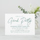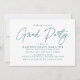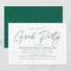 Convites de diversão e festas de formatura modernas com "Formando Party" em um roteiro verde com seus detalhes de festa de formatura mostrados abaixo. O convite simples de festa de formatura inverte-se para exibir um padrão geométrico giro, verde e branco pontilhado.