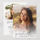 Convite de festa de formatura elegante com a foto do formando sobreposta com "formando" em uma escrita moderna e seu nome e ano de aula em uma simples tipografia. No verso, adicione uma foto adicional e os detalhes da parte do formando.