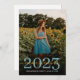Um convite ousado para festa de formatura de fotos moderna, feito pelo 'boho chic', com fotos e ano de aulas de formatura. Adicione suas fotos de formatura criativa. Adequado para a faculdade ou segundo grau. Um estilo criativo individualista. Adicione uma segunda foto ao fundo do convite. Matizes de ouro amarelo e azul. Você pode alterar a cor do tipo ao personalizar, rolando para baixo e selecionando "editar com ferramenta design". Basta selecionar o ano na paleta de camadas à esquerda e escolher cores à direita.