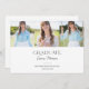 Este anúncio de graduação minimalista apresenta três fotos, uma simples tipografia e uma paleta de cores preto e branco. Na frente, as três fotos são exibidas ao longo da parte superior da placa de formando. Por baixo das fotos, o "Formando" é escrito na tipografia moderna de todos os bonés, com o nome do formando escrito na caligrafia abaixo. Na base, adicione a escola de formando e o ano de graduação. Na parte de trás, há uma modelo para os detalhes da festa de formatura.