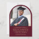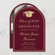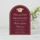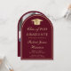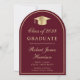 Anúncio e convite de festas vermelho em forma de arco clássico com formandos vermelho em forma de burgundy apresentando um boné de formando de ouro, o nome do formando e o ano de classe em um roteiro elegante de ouro, e sua universidade, major e honra. No verso, adicione uma foto e personalize seus detalhes do partido.