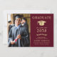 Elegante convite de festas vermelho-burgundy com boné de formando de ouro, foto do formando, seu nome na tipografia clássica da serifpografia de ouro e sua escola, major, honras ou planos futuros. Adicione os detalhes da sua festa no verso.