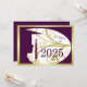 Uma silhueta de um jovem em seu boné e vestido. Designs florais são usadas em segundo plano. O fundo tem um fundo roxo com letras douradas para os convites de festa de formatura.