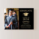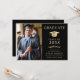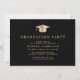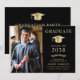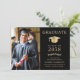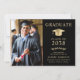 Convite de festa de formatura elegante preto e dourado que apresenta um boné de graduação, a foto do formando, o nome em tipografia serif clássica e a escola, curso, honrarias, etc. Personalize os detalhes da sua festa no verso.