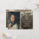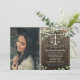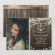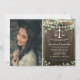 Convites de festa de formatura em direito country rústico com fundo de madeira, foto do graduado, verde água elegante, luzes de corda, balança da justiça e modelo de texto moderno fácil de personalizar.