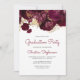 Este elegante convite de festa de formatura apresenta uma borda floral superior de flores de burgundy e folhas de folhas de folhas falsas de ouro. As palavras "Festa de formatura" e o nome do convidado de honra aparecem em um roteiro casual de burgundy, com o resto do texto personalizável em cinzas de carvão, serif. Substitua facilmente a imagem de exemplo no verso por sua foto vertical.
