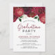 Convite para festa de formatura floral elegante, com um fundo branco clássico, flores de rosa vermelha burgandy decoradas com decoração falsa de ouro e folhagem verde e modelo de celebração de graduação que pode ser facilmente personalizado.