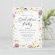 Convites elegantes para festas de formatura florais com detalhes de sua festa de formatura enquadrados por flores de aquarela em tons roxos e amarelos com folhagem verde esmagadora. A parte traseira do convite exibe a foto vertical de sangria de cheio. Os convites para a graduação floral amarela e púrpura são perfeitos para formandos segundos graus e universitários.