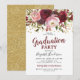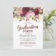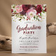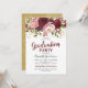 Convites de festa de formatura rústicos com um fundo branco simples que pode ser alterado para qualquer cor, uma variedade de flores florais de cor aquarela marsala vermelho, borgonha e rosa bege, purpurina dourada e um modelo de festa de formatura moderno.