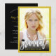 Um convite de festa de formatura 2-em-1 moderno e elegante com design minimalista e cartão de anúncio de graduação com uma foto personalizada dentro de uma moldura branca e um simples script de caligrafia em negrito com um destaque de um chapéu de formatura.