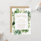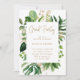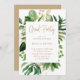 Um convite para festa de formatura botânica moderno com o título "Partido Formando" em uma elegante letra manuscrita juntamente com seus detalhes dentro de um quadro geométrico cercado por um verde tropical pintado com aquarela e folhas falsas de ouro. A parte de trás é um tom dourado correspondente. Este design é perfeito para um formando feminino.