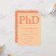 Um convite de festa de formatura de doutorado em tons de laranja e branco. Este convite também tem um padrão da palavra PhD no verso.