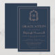 Este design de convite clássico, elegante, para festa de formatura de rosa, apresenta um monograma cor-de-rosa empoeirado em letra serif aberta, rodeado por uma crista de acanthus em um fundo azul marinho. Personalize o texto com o nome do formando e os detalhes da parte. Uma borda retangular de cor rosa enquadra o design. A parte traseira da placa é azul marinho estável. Ideal para segundo grau, faculdade ou formando universitário.