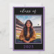 Moderno e chique, este convite de festa de formatura combina preto clássico e branco com acentos de roxo brilhante. É design mínimo é um design simples e divertido para celebrar o grande dia do formando. O verso exibe a foto favorita do seu formando. Criado pela imprensa simplesmente de farmácia.